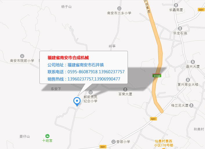 我們的聯(lián)系方式 公司名稱:福建省南安市合成機(jī)械 公司地址:福建省南安市石井鎮(zhèn) 聯(lián)系電話:0595-86087918 13960237757 銷售熱線:13960237757,13906990477 傳真號碼:0595-86087918